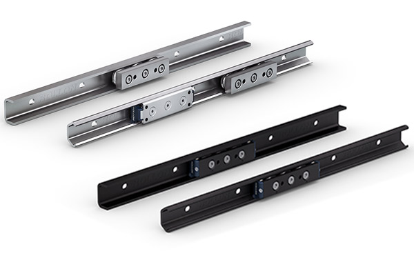 The linear guides with shaped raceways and the linear guides with flat raceways are available in stainless steel or galvanised or nitrided metal sheeting. With the T + U configuration, the X-Rail system can compensate for any axial misalignment in parallelism of the mounting surfaces.